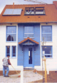 Fünf bis sechs Quadratmeter Sonnenkollektoren bringen beim Passivhaus 50 bis 70 Prozent des Brauchwasser-Wärmebedarfs. Eine Wärmepumpe und die Wärmerückgewinnungsanlage decken weitere Energieanteile ab. An zehn bis 20 Tagen im Jahr wird ein Kamin mit Holz- oder Gasfeuerung als Zusatzheizung benötigt.