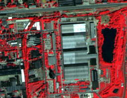 Eine Industrieanlage in Chemnitz aus der Sicht des Satelliten. Bäume und Sträucher sind rot dargestellt.