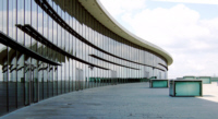 Storch und Ehlers wählten eine Gestaltung, die unverwechselbar ist und nur an diesem Ort inszeniert werden kann. Das markante Element ihres Entwurfes ist die Verlängerung der neuen Terrasse, die sanft ansteigend zur Marienbrücke den Schwung des Elbbogens aufnimmt und die Verbindung zum Ostragehege herstellt. Von dieser Schräge aus erschließt sich der Blick auf die Konturen der Stadt, den Strom und die Elbhänge. Und die Schräge teilt sich auch dem Inneren des Hauses mit. Am Platz zwischen Erlweinspeicher und Kongresszentrum befindet sich der wichtigste Zugang, ergänzt durch einen weiteren Eingang an der Devrientstraße, der bei großen Veranstaltungen genutzt werden kann.